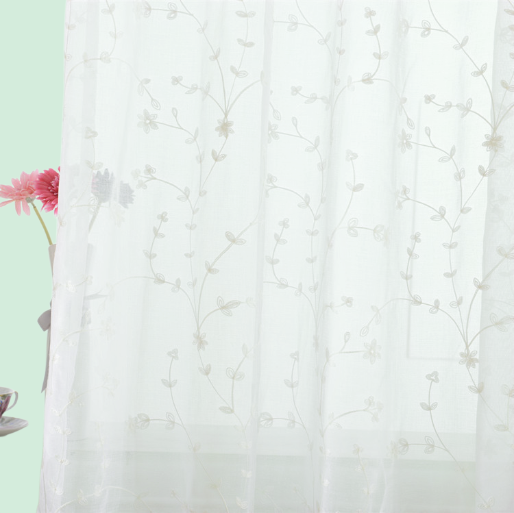 綿麻素材を使用したホワイト小枝刺繍カーテン。通気性と遮光性を兼ね備え、バルコニー窓に適合。完成品で簡単取付け。